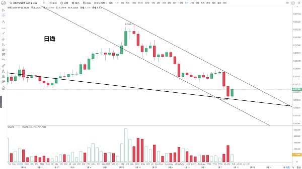 日線上,前期觸頂0.34美元開始一路下探,整體處于下降通道內運行,這兩天持續大幅下殺,短線超跌嚴重,今日觸及趨勢線支撐開啟反彈,上方壓力0.23美元,近期延續反彈概率大。