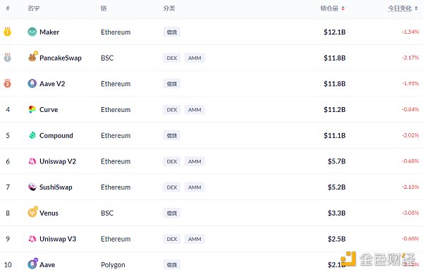 鎖倉量排名前十的借貸平臺 排名來源:Debank