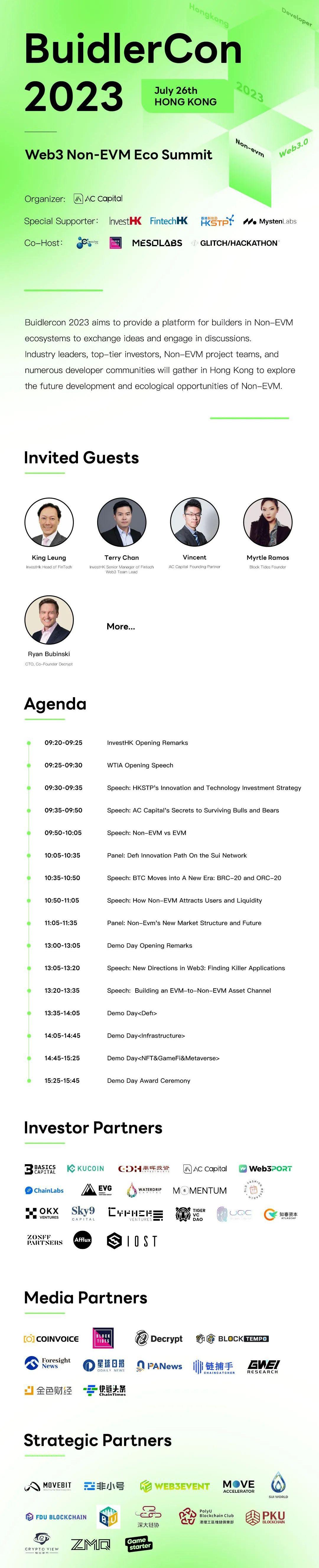 BuidlerCon2023由ACCapital主辦、MolecularHub、BlockTides、Mesolabs和GLITCHGlobal協辦、旨在促進Non-Evm生態的建設者交流,共同探討Non-EVM領域的未來發展及市場格局。