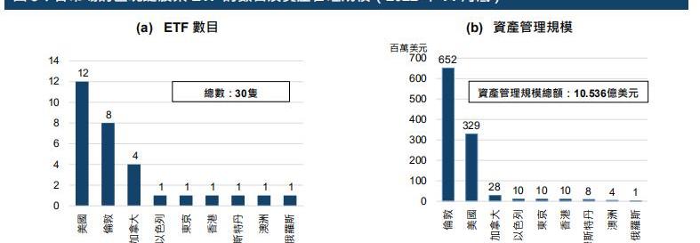 于2022年11月底,加拿大、巴西、美國及澳洲多個市場共有40只虛擬資產ETF,涉及資產管理規模總額達24億美元;