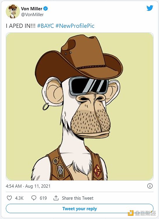 除此之外,還有許多來自丹佛野馬隊(Denver Broncos)的退役和現役球員,也投身“無聊猿”NFT。其中,線衛馮·米勒(Von Miller)就在8月初宣布自己購買了“無聊猿”NFT,此前,開球員布蘭登·麥克馬納斯(Brandon McManus)和退役的野馬隊球員泰勒·波倫布斯(Tyler Polumbus)和布蘭登·斯托克利(Brandon Stokley)也都進行了購買。事實上,波倫布斯在推特上說他曾擁有三個“無聊猿” NFT,然后將其中一個賣給了斯托克利。不僅如此,波倫布斯還表示,他擁有Micah Johnson的Aku NFT藏品,并發布了關于 Alphabetty NFT 的推文。