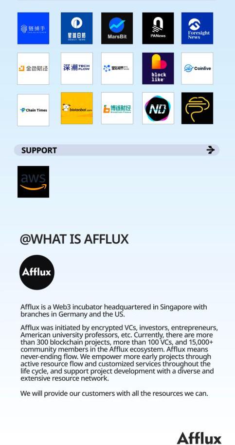 Afflux是一家總部位于新加坡的Web3孵化器,在歐洲和北美均設有分支機構。Afflux由加密VC、企業家、美國大學教授等發起,目前擁有300多個區塊鏈項目,100多個VC,15000+社區Afflux生態系統中的成員。Afflux意味著永無止境的流動。我們通過活躍的資源流動和全生命周期的定制化服務賦能更多早期項目,以多元化、廣泛的資源網絡支持項目發展。我們將為客戶提供我們力所能及的一切資源。