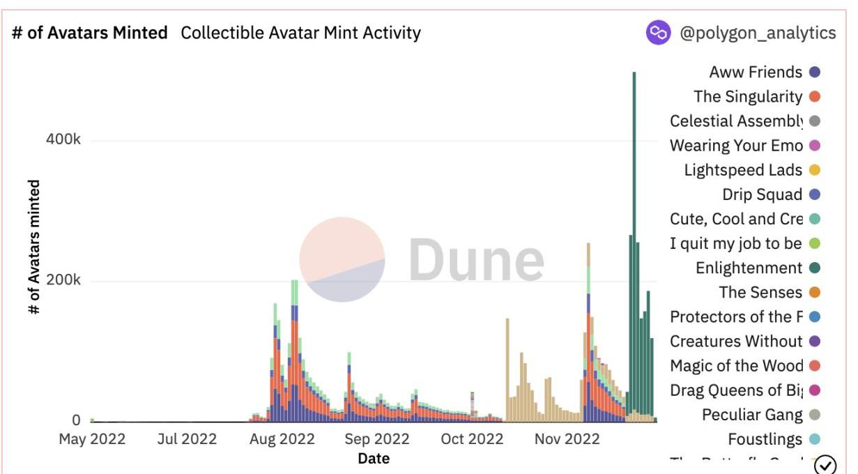 Reddit一直是加密社區活躍的應用程序之一,今年可以說是它邁入加密步伐最大的一年。今年1月,Reddit開始測試NFT頭像功能,并于3月公布在為其加密團隊和NFT平臺招聘多位工程師。5月,Reddit成立RedditX,致力于構建區塊鏈等新功能。并于7月表示將推出NFT頭像市場。8月時向部分用戶空投了基于Polygon的「收藏頭像」。截止發文,該NFT的鑄造量已超676萬枚。