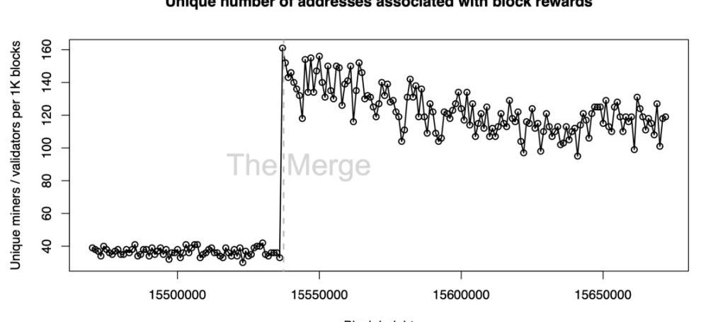 以合并前后數千個區塊為例,我們可以查看每個關聯區塊提議者地址區塊集中度。在合并之前,只有十幾個挖礦地址與獎勵相關聯,其中包括Ethermine等。合并后,數千個地址與驗證者相關。在通過一個急劇變化的閾值交叉后,唯一獎勵驗證者地址的數量差異變得很大。