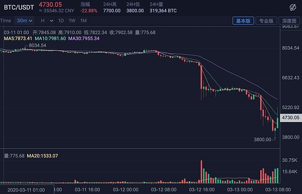 受新冠疫情帶來的恐慌影響,比特幣從2月13日開始下跌走勢。3月12日開始上演跳水行情。3月12日18:10,比特幣從7300美元開始下跌,半個小時內跳水至5555.55美元,暴跌近24%。3月13凌晨4點再度從6000美元跳水至4350美元,再度暴跌近27%。3月13日9:45再度跳水至3800美元。24小時跌幅超50%。(注:截止發稿,比特幣價格已從3800美元反彈至4730美元。)