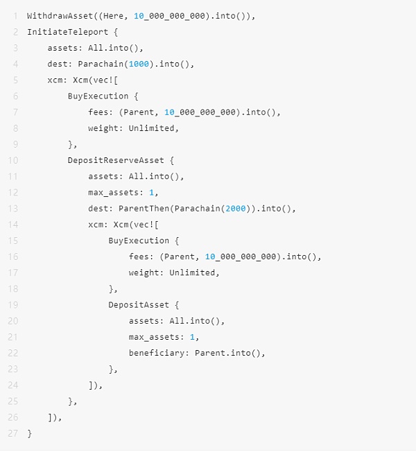 讓我們看一個簡單的例子。我們將一個資產 (1DOT) 從中繼鏈傳送到 Statemint (Parachain 1000),在那里購買一些執行時間,然后使用 Statemint 作為儲備,我們將把資產存放在 Parachain 2000 上。原始 (無錯誤報告) 消息如下所示: