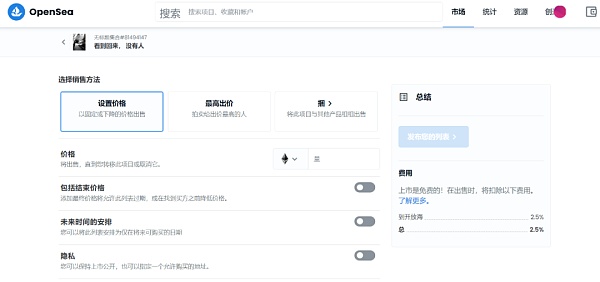《鏈新》鑄造這幅《See back, no one》作為一個無描述、無屬性、無可解鎖功能的“三無”NFT產品,或許和很多NFT一樣,沒有什么實際價值,但是只要用戶點擊“賣“按鍵,平臺便會為其提供設置價格、最高出價、捆綁出售等三種售賣方式。