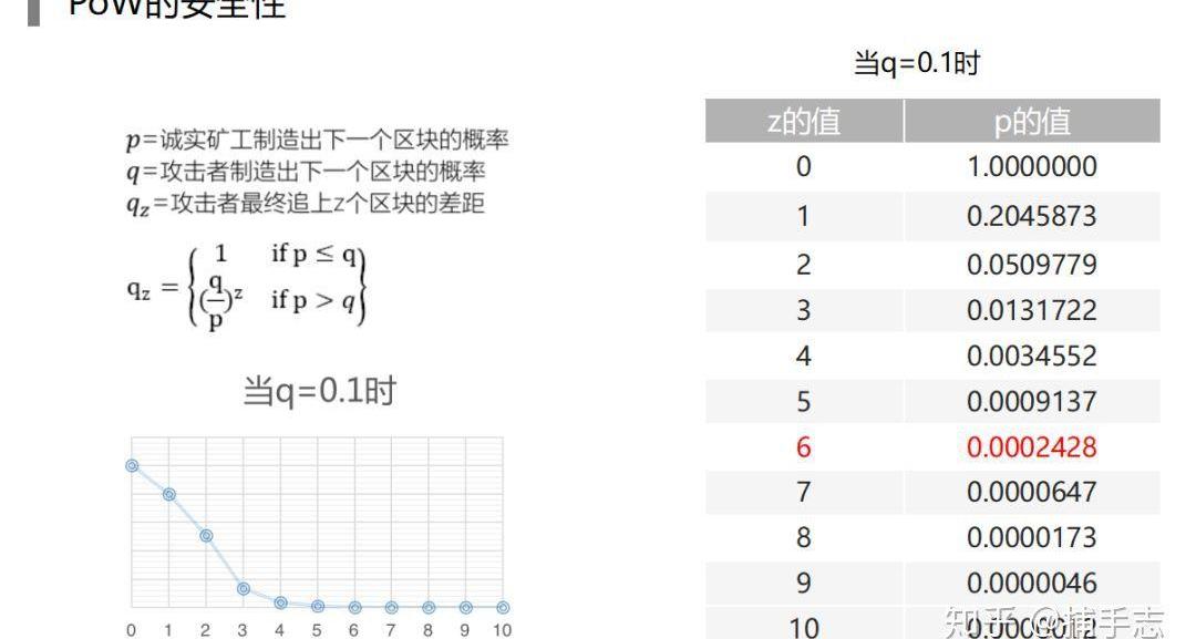 左邊的圖是追上z個區塊的的概率曲線,我們看到,在z=6的時候,它的概率幾乎等于0,這也是為什么在比特幣的早期,中本聰認為6個區塊鏈交易確認以后,這筆交易就算作是絕對的安全的原因。