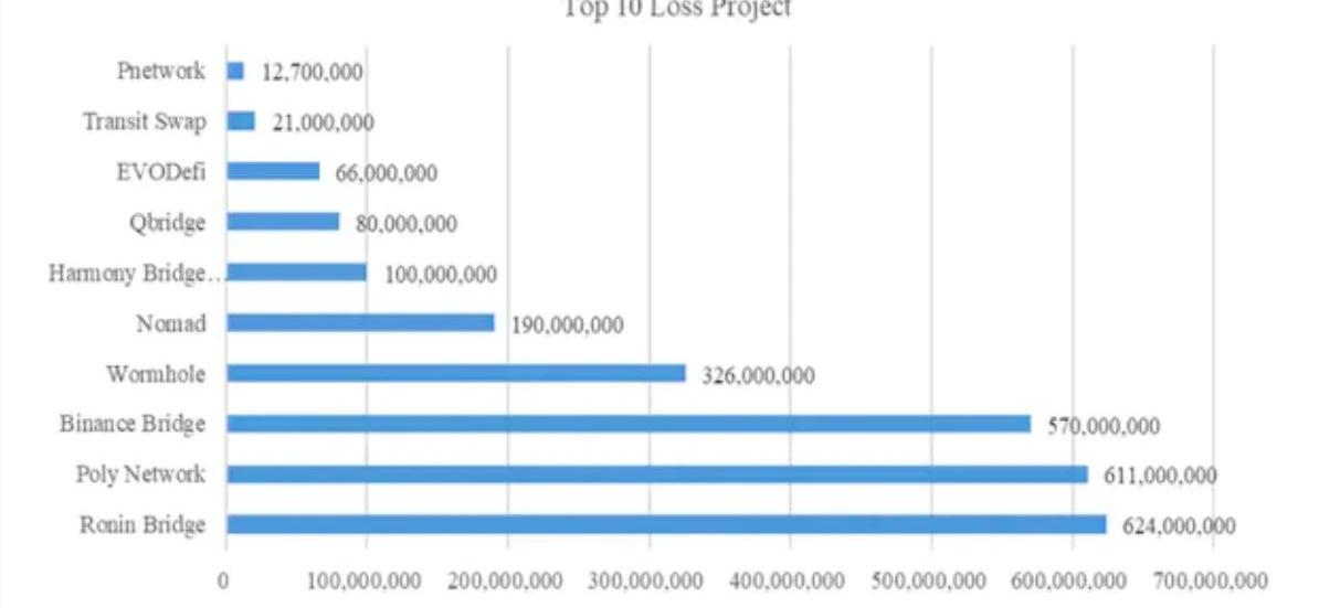 XRP/HKD+2.57%多鏈生態的繁榮催生了用戶對跨鏈的需求。鏈與鏈之間的跨鏈交互的日益增加,但與此同時跨鏈安全事件頻頻發聲,跨鏈安全成為市場關注的焦點。根據成都鏈安等聯合發布的《2022年全球Web3區塊鏈安全態勢報告及加密行業監管政策總結》,2022年Web3領域因各類攻擊造成的總損失達到了36億美元,其中跨鏈應用安全事件造成的損失占比52.5%,居所有項目類型損失第一位。根據公開數據整理,2021年和2022年共發生25起跨鏈應用安全事件,19個跨鏈橋項目遭到攻擊,總損失額達到26.46億美元。黑客攻擊導致損失上億美元的跨鏈項目包括RoninBridge、PolyNetwork、BinanceBridge、Wormhole、Nomad、HarmonyBridge(Horizon),損失金額分別達到了6.24億美元、6.11億美元和5.7億美元、3.26億美元、1.9億枚美元和1億美元。