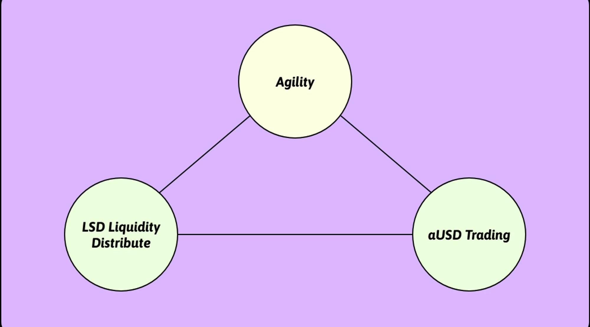 Agility同樣支持ETH質押,并生成aETH;除此之外,其還接受stETH、rETH和frxETH三種LSD質押,并會生成aLSD。用戶獲得aETH以及aLSD后,可以選擇:直接持有aLSD,獲得相應的LSD質押收益;使用aLSD或aETH參與LSD流動性分配系統,為選定的金庫提供流動性并獲得收益;質押aLSD或aETH鑄造aUSD,用于交易或對沖風險。什么是LSD流動性分配系統?這是Agility協議為各類LSD協議開設的流動性捕獲通道,可以很好地幫助他們提高初始流動性,每個LSD策略金庫服務的協議都不一樣,例如:在Aura上為rETH-WETH交易對提供流動性……此時,持有arETH的用戶可以將自己的aLSD資產存入該金庫,從而獲取收益,包括三種:質押LSD本身產生的100%收益;30%的策略金庫收益;esAGI代幣獎勵。最初的策略金庫是由協議或合作伙伴創建的,此后新金庫的創建將由AgilityDAO決定。