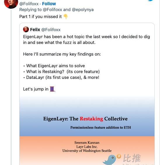 EigenLayer可以徹底改變用戶使用以太坊的方式。它不僅允許用戶通過選擇將他們的ETH抵押在其他協議上來獲得更高的收益,而且還提高了以太坊上的互操作性、效率和治理的有效性。簡而言之,EigenLayer可能是以太坊真正的游戲規則改變者。FluidProtocol開發人員MeirBank稱其為自以太坊推出以來最重要的協議,并且是“一件大事”。Coinbase協議專家和參與EigenLayer種子輪融資的天使投資人ViktorBunin表示:“Sreeram和團隊正在解決一個極其困難的問題,但這個問題有可能產生巨大的影響,有數百億美元的抵押ETH,未來會有萬億。讓這些資金發揮作用可以讓行業走上更好的道路。”