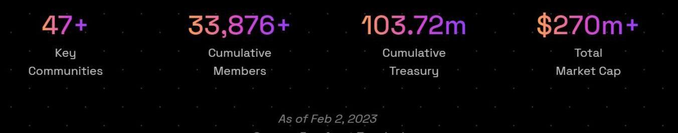 據ForefrontTerminal統計數據,截至2023年2月2日,Pulse涵蓋的重點社區數量達47個以上,累計會員達33876名以上,累計金庫余額約1.03億美元,項目總市值2.7億美元以上。