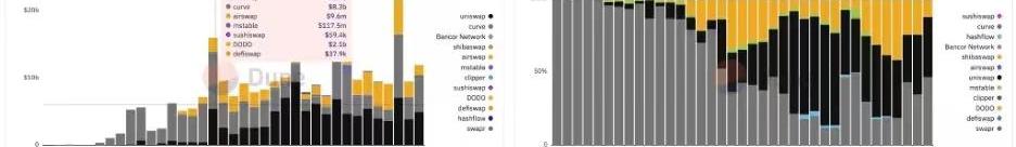 來源:DuneAnalyticsCurve一直是穩定幣交易的主要戰場。它的大部分交易量來自最大的穩定幣流動性池3Pool的組成部分,該池由USDT、USDC和DAI組成。然而,從2021年開始,算法穩定幣UST已經成為人們關注的焦點。它最出名的是它的收益率機會,用戶可以將UST以19%的APY存入Anchor協議。穩定幣MIM背后的協議Abracadabra看到了這一機會,并圍繞UST推出了“degenbox”戰略。該策略允許用戶通過利用MIM和循環策略獲得額外的UST收益。憑借這兩種穩定幣所能提供的高收益率,UST和MIM在2022年1月以150億美元的總市值成功躋身穩定幣前8名。同月,他們還在Curve上的總交易量上增加了USDT和USDC的交易量,占46%的主導地位。然而,Terra建立的算法模型被證明是不可持續的。結果,UST大幅跌破1美元掛鉤匯率,從此一蹶不振。與UST密切相關的MIM市值也大幅下降,表明持有人正在退出其持有的MIM份額。UST崩盤一個月后,UST和MIM在Curve上的交易量下降到僅2.2%。3.Uniswap正在穩定幣對交易量上追趕Curve