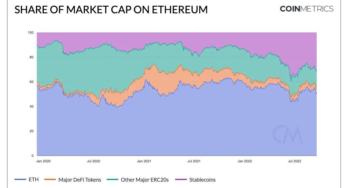 資料來源:CoinMetricsFormulaBuilder以太坊區塊鏈上發生的有趣動態之一是代幣市值與基礎層資產ETH相比所占的比重。由于最近幾個月的市場表現,精明的投資者將他們的財富存放在穩定幣中,同時避開風險較高的資產,這從穩定幣在總價值中的份額不斷增加可以看出。在2021年春季牛市期間,DeFi代幣的市值份額在以太坊區塊鏈上暴漲。