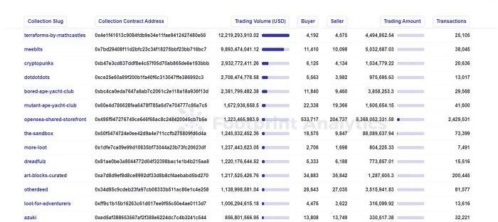 9、截至2022年底,市值最大的NFT系列是CryptoPunks,約達11億美元。LarvaLabs于2017年推出的CryptoPunks是第一個成為家喻戶曉的NFT系列,并且擁有業內最高的地板價。YugaLabs于2022年3月獲得了該NFT系列的IP。10、YugaLabs旗下NFT藏品組合交易額達到31億美元,包括:BoredApeYachtClub、MutantApeYachtClub、BoredApeKennelClub、Otherside和CryptoPunks,但不包括Meebits。11、YugaLabs的投資組合約占整個NFT行業總市值的20%,涉及的NFT系列包括:BoredApeYachtClub、MutantApeYachtClub、BoredApeKennelClub、Otherside、CryptoPunks和Meebits。12、在沒有任何吸收交易過濾的情況下,TerraformsbyMathcastles在11,341筆交易中的交易量達到了驚人的120億美元,超過其他NFT集合,該NFT系列的交易額中,99.8%是洗售交易,46.3%的交易量被檢測為洗售交易。13、過濾掉洗售交易的話,CryptoPunks的交易額最高,達到29億美元,其次是BoredApeYachtClub,約為23億美元。14、ArtBlocksCurated是交易量第四大的NFT藏品,市值達到3.25億美元。雖然NFT市場由多個YugaLabs旗下項目主導,但高端藝術NFT市場ArtBlocks卻殺出一條“血路”,其NFT交易額位于前列。15、洗售交易量達95%以上的NFT藏品系列主要有7個。對于這個統計數據,主要涉及實際交易額超過100萬美元的NFT系列,分別是:TerraformsbyMathcastles、MoreLoot、dotdots、Dreadfulz、Audioglyphs、CryptoPhunksV2和Meebits。與NFT市場和NFT區塊鏈有關的6組統計數據