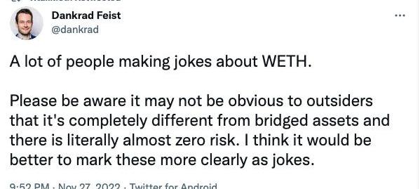 cygaar并不是唯一一個“開玩笑”的人,在其之后,更多的加密KOL加入了這場FUD。擁有23.1萬粉絲的TheDailyGwei主持人AnthonySassano發文稱:“我有一個認識了十來年的老友,他告訴我WETH即將脫鉤并全面崩盤,我不知道具體的事情。”幾個小時后,Anthony表示這就是惡搞帖子,WETH很安全。擁有3.8萬粉絲的Gnosis聯合創始人MartinK?ppelmann發文稱:“隨著ETH不斷被銷毀,wrappedETH(WETH)不再得到完全支持。我們可能很快就會看到WETH贖回擠兌。”幾個小時后,Martin解釋稱這就是個笑話,「希望不會引起太多混亂」。如果說大V們的惡搞只是小打小鬧,那么poordart的加入無疑讓人們未細究之下產生恐慌情緒。11月27日,poordart發文稱:“很不幸謠言是真的。整個項目將被歸還給社區。我將退居到一個非引渡國進行精神健康休養。對不起各位,祝你們好運。”