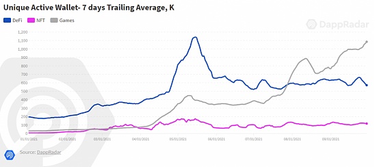 第三季度可能是區塊鏈游戲歷史上最重要的時期。玩賺運動活力得到充分展現,部分游戲dapp在各自的生態系統中開始占據主導地位。此外,游戲部門催化了區塊鏈應用增長的積極趨勢,連接到游戲的UAW數量增長到幾乎成為該行業U的一半。