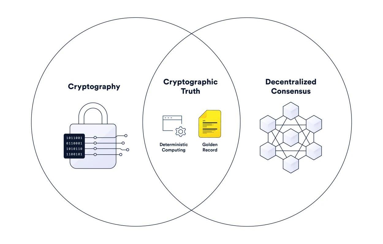 加密事實結合了加密技術和去中心化的共識,在分布式網絡中達成共識,創建統一的記錄,并以確定性的方式為應用展開計算。總的來說,加密事實在博弈論的背景下采用密碼學和去中心化的共識機制,使用各種經濟激勵機制,以確定性的方式執行代碼,并以不可篡改的方式將計算結果儲存在分布式賬本中。加密事實可以讓區塊鏈實現四種信任最小化功能:數據庫:以不可篡改的方式儲存數據,并為世界上任何用戶提供數據;比如:追蹤商業流程的當前狀態。賬本:以不可篡改的方式追蹤變更過程,任何人都可以驗證某個流程的歷史數據;如:資產所有權變更或應用底層代碼。計算:以防篡改的可靠方式執行應用代碼邏輯;如:轉賬或結算參數合約。驗證:驗證鏈下事件的真實性;如:驗證預言機或Layer2等鏈下計算的有效性。區塊鏈可以執行這些功能,因為區塊鏈基于去中心化的節點網絡運行,使用開源軟件維護透明的分布式賬本,并建立了獎懲機制來激勵誠實行為。然而,區塊鏈只能夠使用在鏈上儲存或創建的數據來針對可驗證的事件達成共識。比如,區塊鏈使用賬本中的賬戶余額和公/私鑰加密技術來驗證通證轉賬交易。預言機利用去中心化的鏈下計算來針對外部數據和事件達成共識。然后,預言機計算結果會得到驗證,保障區塊鏈共識正確地執行了計算結果。比如,ChainlinkPriceFeeds是去中心化的預言機服務,為區塊鏈聚合并傳輸金融市場數據。區塊鏈可以查看每個預言機的簽名,驗證一定數量的預言機節點提交了喂價,并自動取喂價中位數。這樣做是為了確保每個有效的預言機喂價更新都有足夠高的去中心化水平、抗女巫攻擊能力以及正確的聚合方式。此外,ChainlinkVRF是一種預言機服務,可以生成可驗證的隨機數,并傳輸到區塊鏈。區塊鏈可以查看預言機提交的加密證明,驗證通過后再接受隨機數。加密證明可以證明隨機數是基于seed和預言機私鑰創建出來的,并同時保障了不可篡改性和不可預測性。有了這些預言機服務,去中心化金融應用可以基于當前市場價格自動執行,NFT項目和區塊鏈游戲應用也可以在NFT鑄造和游戲過程中獲得可驗證公平性的隨機數。