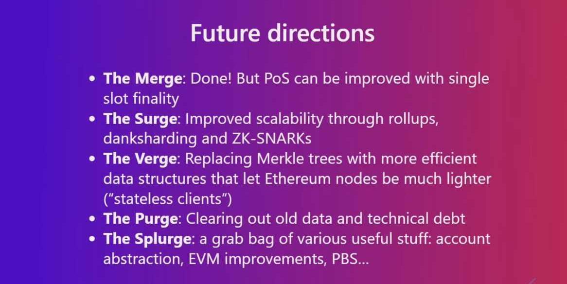 11)未來方向-TheMerge已經完成,但PoS機制還可以通過slots最終確定性進行改進;-TheSurge:通過rollups、danksharding和ZK-SNARK提高可擴展性;-TheVerge:用更高效的數據結構取代以太坊Merkletrees,使以太坊節點更輕;-ThePerge:用于清理舊數據和技術債務;-TheSplurge:一種有用的工具包,帳戶抽象、EVM改進、PBS等。
