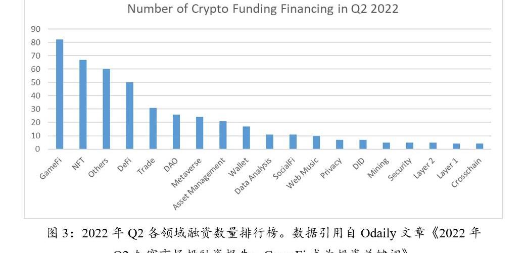 下面回顧一下投資機構在之前關注什么領域。如下圖所示,在Q2,全球加密投資機構最關注的領域為GameFi和NFT。游戲、游戲相關的基礎設施和及技術解決方案共獲得了82筆融資,在數量上排名第一,占融資總數量的16%。GameFi領域的融資金額同樣遙遙領先,高達29.96億美元,占全行業融資總額的23.5%。NFT領域共獲得67筆融資,數量上位列第二。DeFi以50筆融資數量排在第四位。以L1、L2、礦業、隱私、身份等為代表的基礎設施領域成為了“長尾領域”,它們獲取的投資筆數均在10筆左右。