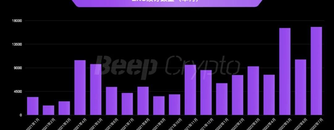數據來源:NFTGO,統計截止時間為2022年7月22日ENS注冊數量從交易數量來看,2019年至今,ENS的交易數85%發生在今年,而今年最活躍的月份在5~7月。