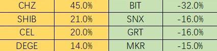 本周BTC下跌2%,ETH表現優于BTC。山寨幣整體弱勢,某些強勢品種活躍。市場熱點逐漸從ETH2.0演進到MEME幣和穩定幣。足球粉絲代幣龍頭CHZ基于11月世界杯基本面利好及官方的積極運作大漲。美國制裁Tornado及相關穩定幣賬戶,引得市場更多地采用去中心化的穩定幣,相關概念的算穩Canto,Kujira,Sperax大漲。DEFI及公鏈板塊大跌。