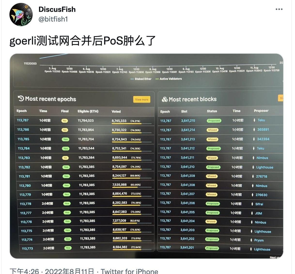 以太坊基金會的研究人員AnsgarDietrichs認為這項測試是成功的。他在推特上表示,在這樣的演習中,成功與否的衡量標準在于最終完成的時間。GalaxyDigital的另一位合伙人表示,雖然合并后的參與率有所下降,但可能是其中一些客戶端出現了問題。但總的來說,合并仍然是成功的。但神魚所發布的推文也一度引發了網友的討論,在Epoch時間113787左右,有大量區塊狀態為“Missed”。