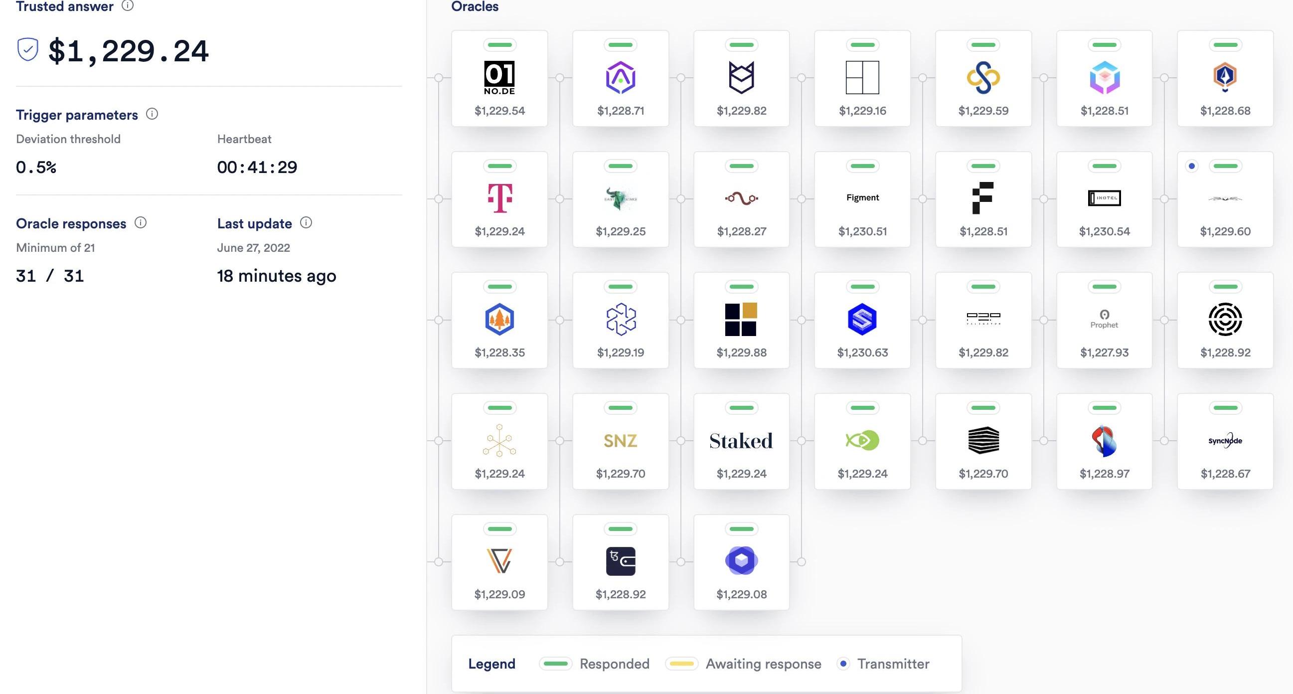 Aave采用了Chainlink的預言機,機制和Maker有相似之處,由多個獨立的Chainlink預言機運營商更新鏈下數據,通過輕量級的共識算法,每個節點報告數據并對其簽名,然后將包含所有觀察結果的單個聚合交易傳輸到鏈上,再在鏈上驗證報告結果并檢查是否達到法定簽名人數。以ETH/USD為例,若鏈下數據波動超過0.5%,或者距離上一次更新超過3600秒時,新的價格數據會被更新到鏈上。該喂價共有31個節點參與,所有節點都處于響應狀態,要求的最低響應節點數為21個。
