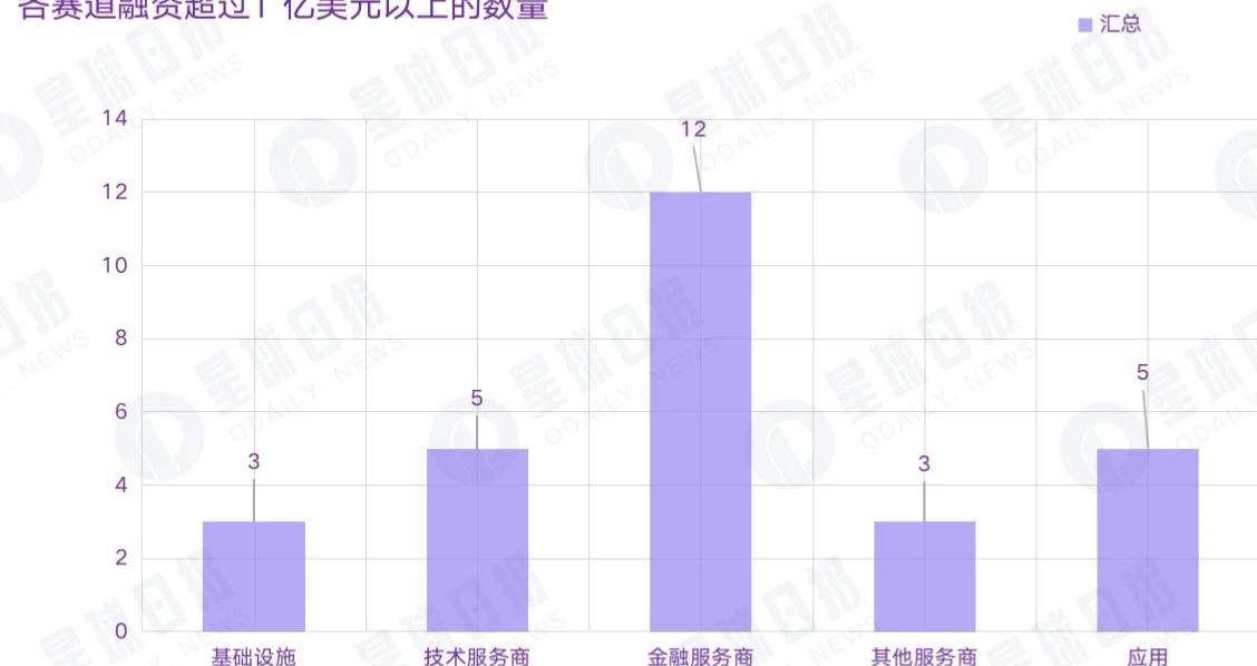 在所有融資事件中,融資規模超過1億美元以上的交易數量達到28筆。其中基礎設施賽道3筆,技術服務商賽道5筆,金融服務商賽道12筆,其他服務商賽道3筆,應用賽道5筆。