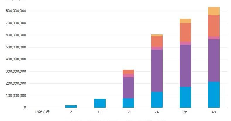開發團隊部分,主要是對來自Flow、DapperLabs和其他公司約90人進行獎勵或者補償。此外,其中一部分預留用于開發者社區,資助對Flow核心和其他開源有持續貢獻的開發者。DapperLabs部分,是企業實體所持有的代幣,作為長期資金進行持有。此外,需要注意的是質押代幣獎勵。作為POS權益證明網絡,Flow網絡要求驗證者節點鎖定以FLOW計價的保證金。Flow每年通過新發行和交易費用的組合,將FLOW作為獎勵分配給質押人。當前計劃設為每年總發行量的3.75%,因此,當交易費達不到該固定獎勵時,會增發新的代幣來彌補這一缺口。隨著交易費和獎勵之間的缺口逐漸縮小,增發率接近0%。如果交易費超過該固定獎勵,超出部分將保存在一個第三方托管賬戶中,按照最初的智能合約版本,這部分交易費并用用于對沖未來的通貨膨脹;但目前,協議更新后,該部分交易費將被銷毀。代幣釋放機制代幣釋放規則中,DapperLabs部分、抵押品儲備部分、以及基金會儲備部分,合計約5.35億枚代幣沒有明確釋放時間。其中,DapperLabs部分為長期持有,如有銷售的,則從銷售之日起有一年鎖定期。抵押品儲備部分不直接進入流通供應。基金會儲備部分用于質押、委托、籌款或者出租給社區組織。除了上述幾個部分,剩余的代幣約為7.15億枚,該部分代幣釋放規則確定;加上質押代幣獎勵部分,代幣釋放數量如圖4-2所示。Flow上線滿24個月后,代幣流通量約為6.07億枚;上線36個月后,流通量為7.36億枚;上線48個月后,代幣流通量為8.33億枚。FLOW代幣第一年的釋放量只有質押獎勵部分,釋放量少。大量解鎖集中在12個月至24個月這一期間。Flow于2020年10月上線,因此,在2021年10月滿12個月,2022年10月滿24個月,因此,該期間將有大約5億枚代幣釋放,可能面臨較大的市場拋壓。