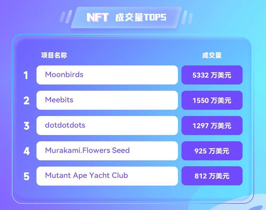 按過去24小時成交量,排名前五的項目分別為Moonbirds、Meebits、dotdotdots、Murakami.FlowersSeed和MutantApeYachtClub。