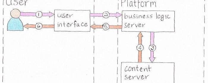 圖3簡單演示了如何通過當前的中心化平臺將內容交付給用戶。用戶通過用戶界面發出請求,用戶界面將請求傳遞到業務邏輯服務器。該服務器確定需要什么內容,然后從內容服務器獲取它。然后準備好要顯示的內容,并發送到用戶界面,用戶界面將其顯示給用戶。業務邏輯和內容服務器由平臺控制,并在平臺的計算機上運行,而用戶界面在用戶的計算機上運行。在DSP下,由于交互界面提供者無權訪問內容,因此它們無法自行執行業務邏輯。這必須在用戶端通過所謂的「用戶客戶端」來完成。用戶客戶端只是一個應用程序或瀏覽器插件,可以執行業務邏輯,并管理用戶的配置文件和錢包。然后,接口提供商的功能只是將業務邏輯發送給用戶客戶端,指示其收集內容并進行編纂,以通過用戶界面進行顯示。