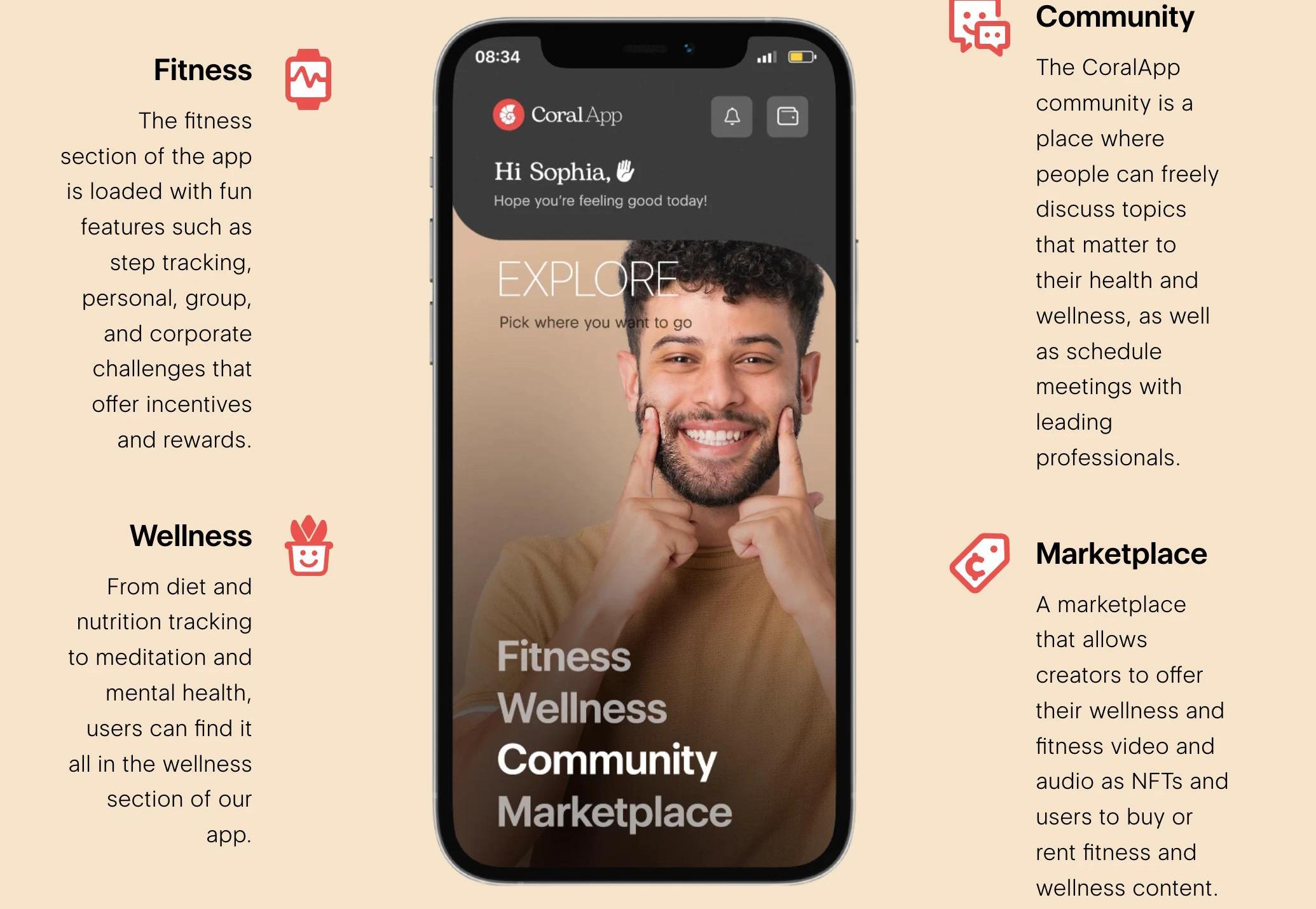 CoralApphttps://mycoralapp.com/CoralApp是一個基于區塊鏈的健身和健康社交平臺。該應用程序的健身部分加載了許多有趣的功能,例如步數跟蹤、個人、團體和企業挑戰,并提供獎勵。此外,CoralApp專注于身心健康,提供了從飲食和營養跟蹤到冥想和心理健康的功能。在其內置市場上,創作者還可以以NFT的形式提供他們的健康和健身視頻和音頻,用戶可以購買或租用健身和健康內容。目前,CoralApp獲得了Ocean協議的資助,用于探索數據質押機制,同時也正在開發Android和iOS版本。