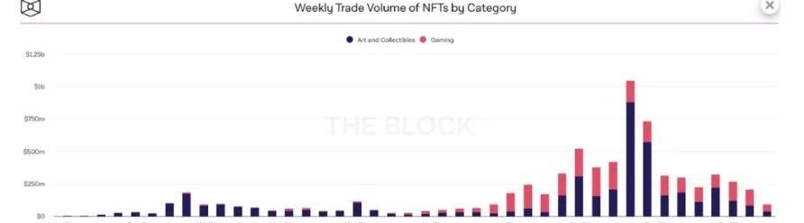 認知NFT的最簡單方式之一:一種區塊鏈原生文件格式,但是它進一步繼承了區塊鏈資產的典型屬性:所有權、最早的所有權/交易流動記錄,以及與資產相關的價值lineage——所有這些都是公開和透明的的。可以認為NFTs是一種將各種數字和實物資產代幣化并放在區塊鏈上的方式,但特點是NFTs是一種人們在數字世界可以進行炫耀的新方式。NFT自2015年以來一直存在,但最近市場比較熱鬧。OpenSea,世界上最大的NFT市場,將在2021年10月超過100億美元的累計交易量。注意,OpenSea在2021年7月才突破了10億美元的累計交易量,這種增長非常驚人的。通常,我們看到NFTs被用于數字藝術、流行文化、體育時刻、游戲,甚至生活體驗。如圖所示,雖然NFT交易量最初由藝術/收藏品主導,但最近與游戲相關的NFT已經開始在NFT社區內看到強有力的應用。