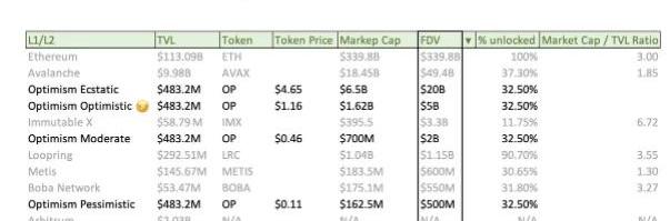 在知道具體空投數量后,大家的第一反應就是OP上線價格能夠達到多高?$10、$5、$1、$0.5、$0.2……對于價格預期,千人千面。不過我們這里可以提供兩個角度來輔助我們進行估值定價。Optimism此前進行過三輪融資。2020年由Paradigm和IDEO領投的350萬美元種子輪。2021年由a16z領投的2500萬美元A輪融資;今年由Paradigm和a16z共同領投的B輪融資,籌集了1.5億美元,估值達到16.5億美元。首先,我們若以B輪融資的估值作為參考的話,OP初始總供應量近43億,計算下來B輪的代幣成本約為$0.38。若我們綜合考慮早期投資者的綜合成本,OP的代幣分配中有17%的比例是分配給投資者的,而Optimism的總融資額約為1.78億美元,計算下來早期投資者的綜合成本約為$0.24。那么接下來,就是思考因人而異的一二級代幣成本溢價的乘數了。10倍、5倍、2倍……鑒于當前大行情的低迷以及早期流通代幣都是“無成本”的空投代幣,所以二級市場能否走出這樣的倍數其實不容樂觀,具體還得看代幣上線時的市場情緒以及莊家買盤。盡管如此,$0.24~$0.38這個價格區間作為一個合理范圍的下限底,還是具有不錯的參考意義的。現在,我們換一個角度,使用市值&TVL等指標進行同行估值對比,嘗試得出合理的估值范圍。
