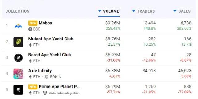 就在發布了BinanceLaunchpool公告后不久,MOBOX用戶量就增加了170%,總數超28,900人。此外,8月份MOBOX還宣布了一系列抽獎活動,獎品包含MOMONFT,這可能也是導致用戶激增的另一個關鍵因素。隨著抽獎報名截止日期的臨近,越來越多的用戶開始涌入該平臺。MBOX是MOBOX上的原生代幣,隨著平臺上交易活動的增加,越來越多的價值被鎖定在智能合約中,與此同時平臺吸引力也大增,并對MBOX的價格產生了積極影響。的確,就在MOBOX策劃的一系列活動開始后,MBOX代幣價格就開始節節攀升,從8月18日的1.98美元漲至8月28日的9.77美元,短短十天漲幅就超過了393%。所有這一切,再加上用戶對于玩賺類游戲興趣的激增,MOBOX在2021年9月又有了不小的飛躍,而令人有些難以置信的是,這僅僅就發生在該游戲推出五個月之后。接下去,MOBOX并沒有固步自封,而是不斷挖掘更多的游戲機制來吸引和留住用戶。我們發現,自2021年9月以來,連接MOBOX的獨立錢包數量穩中有升。不僅如此,繼8月份MOBOX創紀錄地完成了6540萬美元的NFT交易量后,9月份的成績更為驚人,平臺上的NFT交易量幾乎翻了一番,超過1.09億美元。僅去年12月30日一天,MOBOX上的NFT交易額就增長了359%,達到926萬美元,成功超越了AxieInfinity和BoredApes,榮登當天的交易量榜首。