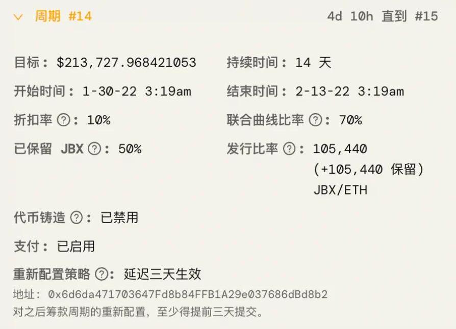 JuiceboxDAO是支持Juicebox協議運作的DAO組織,JuiceboxDAO作為早期的實踐者,在Juicebox上發起眾籌。與AssangeDAO和ConstitutionDAO不同,JuiceboxDAO是為了維持Juicebox協議的發展,需要長期支付工資、硬件等運營成本。JuiceboxDAO設置了更為復雜靈活的資金分配方案。JuiceboxDAO目前正在進行第14期籌款,其參數設置如下:
