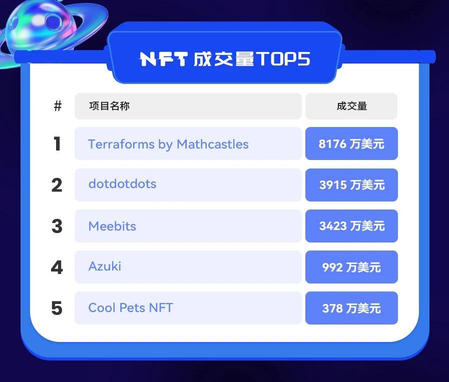 按過去24小時成交量,排名前五的項目分別為TerraformsbyMathcastles、dotdotdots、Meebits、Azuki和CoolPetsNFT。