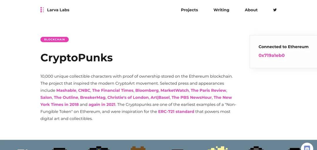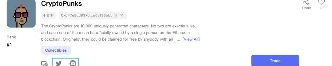 基本介紹、所屬類別市值、總發行量在投資一個項目之前,最應該知道的是這些項目的基本情況和定位。例如,CryptoPunks是一個位于以太坊(ETH)鏈上的收藏品(Collectible)項目,它包含一萬個各不相同的、以像素風朋克小人為內容的NFT,它也是以太坊最早的非同質化代幣項目之一。初期所有人都能在官網免費領取這些NFT,而如今只能通過從其他用戶處購買才能獲得。
