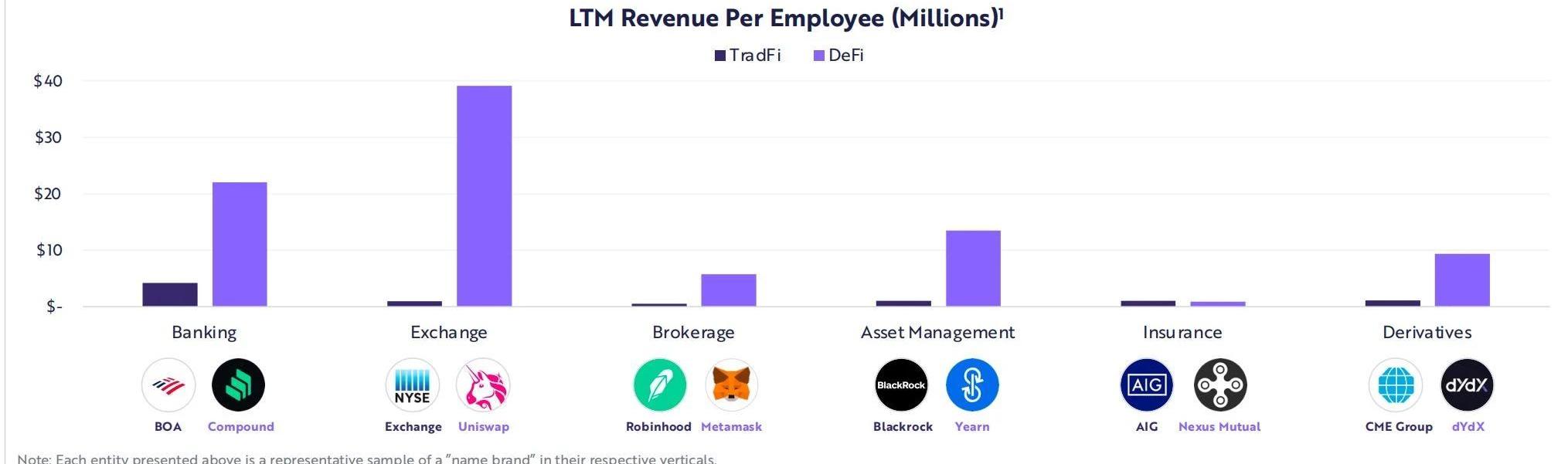 基于智能合約的金融交易幾乎在世界任何地方都能以近乎實時的方式結算。與傳統金融相比,每個員工的收入說明了DeFi的效率。