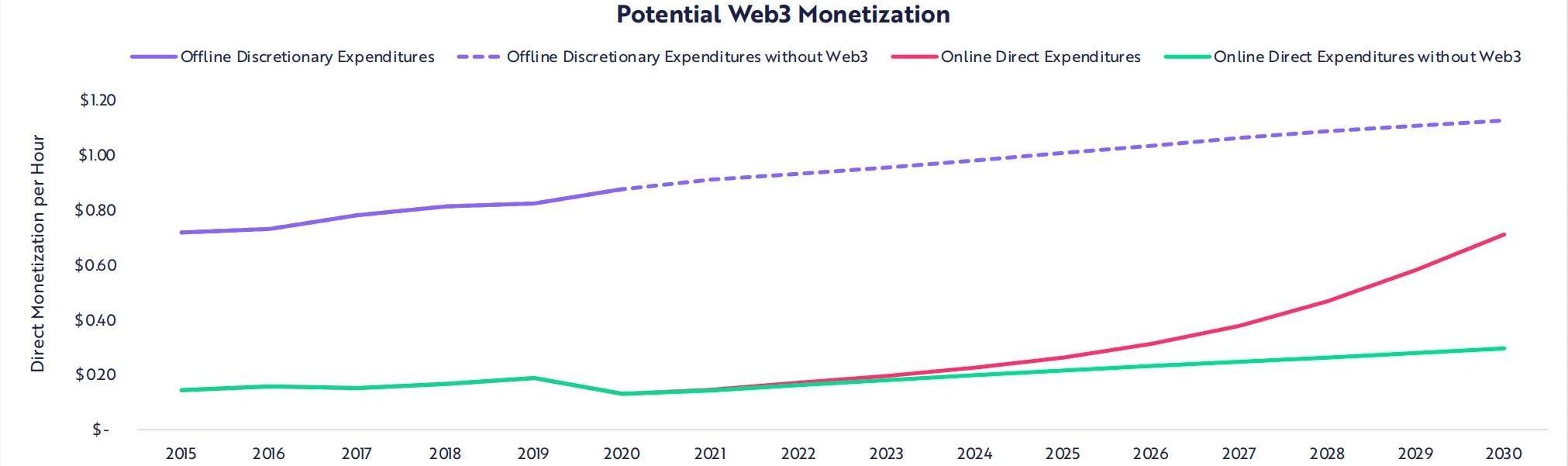 我們的研究表明,在未來十年內,有了Web3,在線消費時長的貨幣化將以19%的復合年增長率增長,而沒有Web3,僅增長8%。