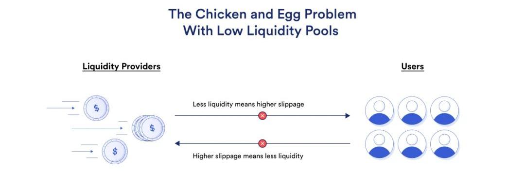 自從DeFi經濟出現以來,流動性一直都是令新項目最頭疼的問題之一。通證機制可以將整個生態冷啟動,團隊也可以用這種方式協調各個參與方的經濟激勵,將一部分用戶費用作為獎勵,并加入到更大的DeFi生態中。然而,為了給用戶提供穩健的流動性來源,讓他們能夠在AMM協議中交易通證,DeFi團隊必須得接入更大的資金池。AMM協議中的第三方流動性提供方可以解決一部分問題。任何獨立的個體只要擁有充足的資金,都可以為交易對提供流動性。團隊還可以從其他地方獲得充足的流動性,而不用自己提供流動性。然而,終端用戶幾乎沒有任何動力來為一個新通證提供流動性,因為這樣做意味著他們要承擔無常損失的風險,以換取非常低的交易費。他們需要在經濟上有充分的理由來承擔這個風險。這就是我們常說的“先有雞還是先有蛋”的問題。如果沒有充足的流動性,交易滑點會打擊用戶參與DeFi協議的積極性;如果沒有用戶參與通證交易,就無法產生足夠的交易費,因此也無法為第三方提供足夠的經濟激勵,建立資金池并提供流動性。
