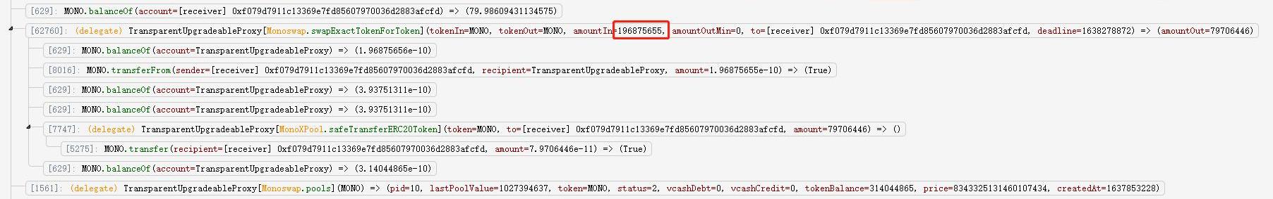 圖11反復兌換,拉升MONO價格對其中一筆兌換交易進行分析,每次兌換的數量是交易池中MONO的總量減去1,這是能夠最大提升MONO價格的兌換數量(使圖8_getNewPrice第527行,分母為1)。另外由于交易池中MONO的總量較低,攻擊者已經通過第1步保證了有足夠的余額進行兌換操作。