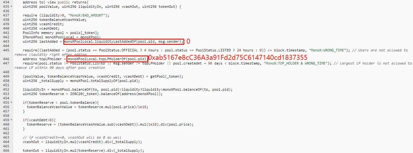 移除Monoswap所有的流動性。這里利用了Monoswap合約中的任意地址流動性移除漏洞。漏洞1:Monoswap合約中未檢測流動性的所有者to是否為msg.sender。_removeLiquidity函數中,如圖2所示,第443行,獲取調用者(攻擊合約)最后一次添加流動性的時間戳,返回結果是0,因此第445行的檢測通過。第446行,topLPHolderOf如果不是調用者(攻擊合約)地址,第447行的檢測通過。此后移除流動性相關代碼中,再無msg.sender相關的操作。