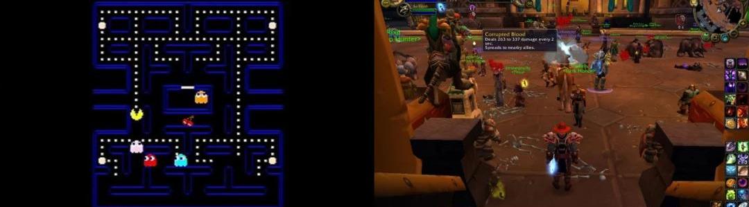 幾乎所有早期的電子游戲都是基于相同的盈利模式開始的,即用戶付費玩游戲。早期游戲如《吃豆人》(下方左圖)在要求玩家支付更多費用之前,讓他們先玩一兩個回合。之后可在個人電腦上玩的游戲,如《使命召喚》或《魔獸世界》(下方右圖),出售永久授權或循環訂閱。雖然交易很簡單,但對用戶沒有太多影響。最顯著的改進就是以內容擴展包的形式提供更多的游戲時間。