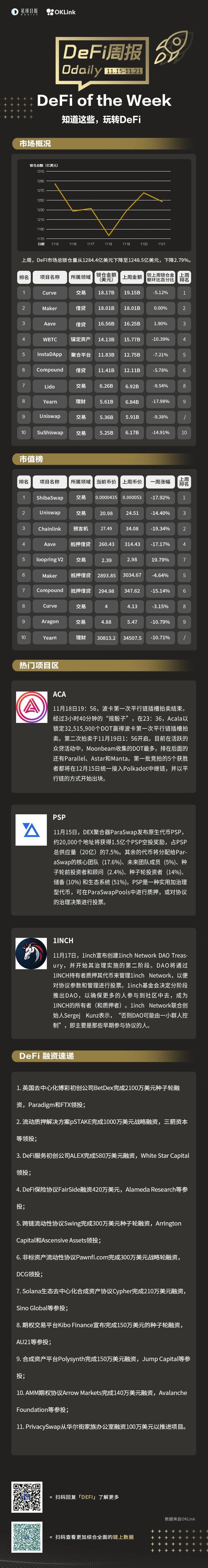ACA11月18日19:56,波卡第一次平行鏈插槽拍賣結束。經過3小時40分鐘的“搖骰子”,在23:36,Acala以鎖定32,515,900個DOT贏得波卡第一次平行鏈插槽拍賣。第二次拍賣于11月19日1:56開啟。目前在活躍的眾貸活動中,Moonbeam收集的DOT最多,排在后面的還有Parallel、Astar和Manta。第一批競拍的5個獲勝者都將在12月15日統一接入Polkadot中繼鏈,并以平行鏈的方式開始出塊。PSP11月15日,DEX聚合器ParaSwap發布原生代幣PSP,約20,000個地址將獲得1.5億個PSP空投獎勵,占PSP總供應量的7.5%。其余的代幣將分配給ParaSwap的核心團隊(17.6%)、未來團隊成員(5%)、種子輪前投資者和顧問(2.4%)、種子輪投資者(14%)、儲備(10%)和生態系統(51%)。PSP是一種實用加治理型代幣,可在ParaSwapPools中進行質押,或對協議的治理決策進行投票。1INCH11月17日,1inch宣布創建1inchNetworkDAOTreasury,并開始其治理實施的第二階段。DAO將通過1INCH持有者質押其代幣來管理1inchNetwork,以便對協議參數和管理進行投票。1inch基金會決定分階段推出DAO,以確保更多的人參與到社區中去,成為1INCH的所有者。1inchNetwork聯合創始人SergejKunz表示,“否則DAO可能由一小群人控制”,即主要是那些早期參與協議的人。融資信息
