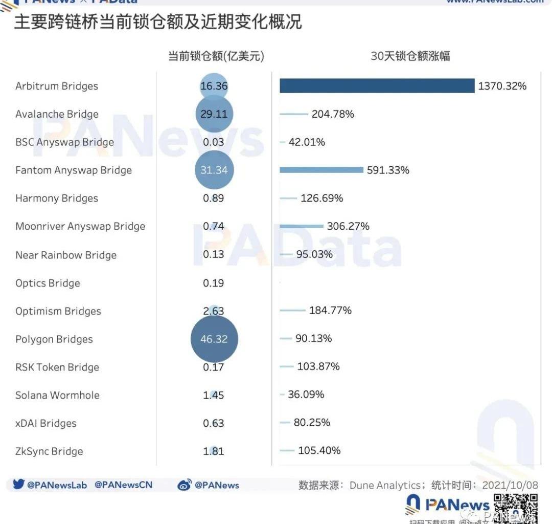 XRP/HKD+2.5%分析師|Carol編輯|Tong出品|PANews如果縱觀DeFi的發展,可以看到一條較為清晰的路徑。DeFi從去年下半年開始,在流動性挖礦的激勵下,率先在以太坊上爆發。但隨著交互需求的提升,以太坊高昂的手續費演變為制約生態發展的重要因素,這客觀上促進了DeFi多鏈時代的到來。今年二季度以來,不少項目開始在Layer2層和其他公鏈上布局協議。但是,多鏈格局下各鏈的DeFi生態仍然相對獨立,多鏈互通成了適應發展的必然需求。跨鏈橋在這樣的背景下成了順應DeFi潮流的新風口,備受市場關注。跨鏈橋的發展現狀是怎樣的?為此,PAData分析了ArbitrumBridges、AvalancheBridge、SolanaWormhole等14個主要跨鏈橋的鏈上數據后,發現:1、目前市面上主要的跨鏈橋多為二層擴展型跨鏈橋,且主要是建立在以太坊上。另外還有部分是鏈專用型的跨鏈橋,這些跨鏈橋也主要以實現與以太坊的互聯互通為目標,這或有助于為其原鏈的DeFi生態引流。2、14個跨鏈橋當前的鎖倉總額已達到約131.80億美元,當前大約是DeFi總鎖倉額的6.26%左右。但整體格局分化顯著,其中,PolygonBridges、FantomAnyswapBridge、AvalancheBridge和ArbitrumBridges的鎖倉額都超過了15億美元,但除此之外,其他跨鏈橋當前的鎖倉額大多都不足1億美元。3、跨鏈橋近期的發展速度很快,最近30天的鎖倉額增幅都在35%以上,其中有8個超過100%,增幅最高的ArbitrumBridges達到了1370.32%。4、目前跨鏈橋的交易規模仍然較小。最近3個月被監測的8個跨鏈橋的日均交易量約為2240萬美元,中位數只有608萬美元。且日均交易量越高的跨鏈橋,其日交易量的波動性也越強,這意味著這些跨鏈橋的日均交易量可能受到單一事件影響而被高估了。5、13個跨鏈橋9月的獨立地址數已猛增至12.76萬個,環比增幅超103%。10月第一周的獨立地址總數已經達到3.46萬個,預計10月全月的用戶規模將在9月的基礎上穩中有升。6、大多數跨鏈橋最近3個月的獨立地址數都表現出了持續增長態勢,其中,ArbitrumBridges、OptimismBridges和NearRainbowBridge的9月獨立地址環比增幅最大,分別達到了3452.87%、538.12%和181.75%。7、在跨鏈橋最近30天鎖倉額最小增長35%情況下,各跨鏈橋原網絡的鎖倉額有增有減,跨鏈橋并未帶來一致的積極影響。其中如Arbitrum和Moonriver的鎖倉額與同期跨鏈橋鎖倉額均有增長,而如Polygon和BSC則在跨鏈橋鎖倉額增長的背景下,生態總鎖倉額有所下降。Layer2型和鏈專用型跨鏈橋占多數