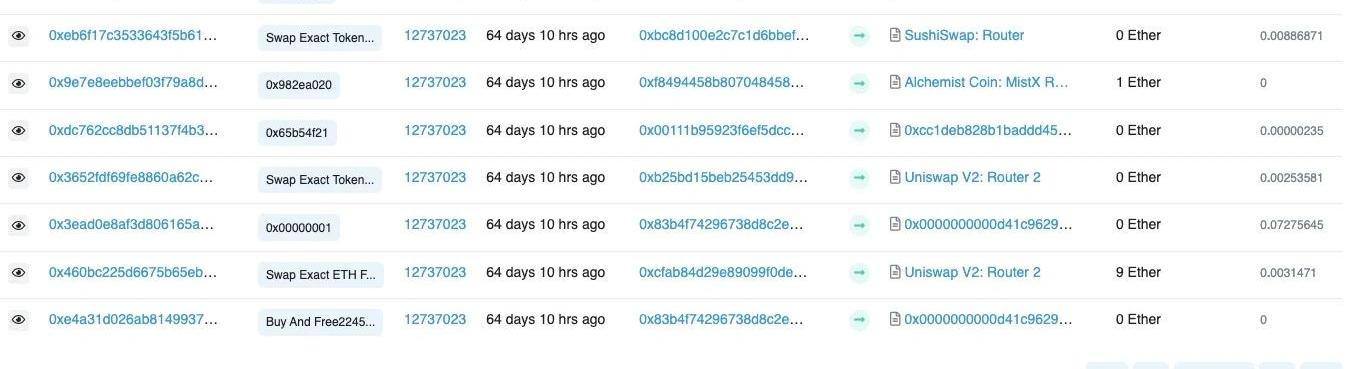 7.2mistXbyAlchemistAlchemist是由@thegostep在2021年2月發的一條Twitter開始的,@thegostep是以太坊、Ampleforth的核心開發者之一,同時也參與了Flashbots。Alchemist是一個完全由社區推動的去中心化組織。目前已有5個核心項目正在進行:Crucible、Copper、mistX、sandwitched查詢和CrucibleNFTDesign。$MIST是Alchemist的治理代幣,主要功能為Alchemist籌集前期研發資金,并進行社區治理,代幣總量無上限,并有增發機制。代幣其中50%給Alude獎勵池,25%給MIST社區多簽,25%給MIST國庫。1.mistXmistX是一個無Gas費的去中心化交易所,通過Flashbots綁定交易,實現交易確認。mistX在鏈上作為交易搜索者,Flashbots將mistX直接與礦工連接,保護用戶發起的交易信息不會發布到公開的內存池,而是以捆綁交易的形式進入Flashbots系統。其他交易搜索者無法搶跑、夾擊該用戶的交易,因為捆綁交易總是位于區塊的頂部。用戶有效地隱藏了交易信息,使其不被搶跑者發現,從而防止交易被操縱,為礦工的爭奪利益提供了公平的競爭環境,是第一個可以讓普通用戶使用Flashbots的應用。通過mistX處理的以太坊交易不需要用戶提供任何Gas費。當一筆交易發生時,小費將被確定并作為交易中的一部分價值通過智能合約調用被提交支付給礦工,用戶不需要確保錢包中持有足夠的ETH支付Gas費用。如果交易失敗或者用戶因任何原因取消交易,都不需要支付任何Gas費,給礦工的小費也將被退回。每一筆通過mistX支付的礦工小費,都會保留其中一部分給mistX平臺,用于支持Alchemist生態系統。核心的CrucibleNFT和crucible.alchemist.wft上相連的Aludal獎勵池。通過crucible.wft訂閱MIST-ETHLP意味著Alchemists在mistX.io交易時可以獲得獎勵。因此,在mistX上進行的代幣交易會對$MIST的價格有直接影響。這種好處不僅獎勵mistX用戶,而且獎勵了Alchemist社區和所有$MIST持有者。mistX.io對以太坊區塊鏈產生了積極的影響,減少了網絡擁堵,促進了效率;通過不將失敗的交易納入區塊,不對失敗的交易收取Gas費,以釋放區塊空間。