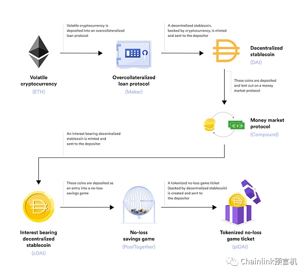 上述應用已經在DeFi領域落地了,以太坊、Chainlink、MakerDAO、Compound和PoolTogether都參與了其中。PoolTogether使用了Maker的穩定幣DAI、Compound的貨幣市場cTokens以及可驗證隨機函數,打造出了創新的去中心化應用,從而無須親自創建穩定幣、開發貨幣市場協議或可驗證的鏈上隨機數。
