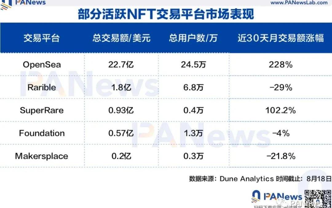 除了以上這些頭像NFT外,包括Animetas、CoolCats等同類型項目也是近期在OpenSea上被熱銷。當然,生成藝術品的NFT平臺ArtBlocksCurated近期也相當受歡迎,其NFT作品交易量出現了大幅增長。例如名為@quantbike的以太坊社區成員最近就用Cryptopunks換取15件ArtBlocksCurate系列作品。OpenSea數據顯示,截至8月18日,ArtBlocksCurated銷售額超6.5萬枚ETH,擁有者達5500名。其中,ArtBlocksCurated于8月12日以2173枚ETH的日銷售額創歷史新高。從近一月的平均售價來看,ArtBlocksCurated增長了3.4倍。而幻想足球游戲sorare也算是最近NFT市場的黑馬。OpenSea數據顯示,sorare的銷售額超5萬枚ETH,擁有者數量近33萬。僅過去24小時,sorare的銷售額就暴增了超1470.5%。從平均售價來看,sorare近1個月增長逾1.4倍。此外,具備科幻性的NFT卡牌游戲ParallelAlpha也正受到大量關注。雖然ParallelAlpha尚未上線,但憑借擁有暴雪、EpicGames、育碧、夢工廠動畫等優質團隊背景,其NFT銷售額于7月底開始爆增。OpenSea數據顯示,ParallelAlpha總交易額超1.7萬枚ETH,用戶數超6200名,僅過去7天的銷售額增長了198.5%。同樣,ParallelAlpha的平均售價也顯著上漲,近1個月翻了21.8倍。由此來看,OpenSea交易額和用戶數創新高背后,很大程度得益于熱門項目的銷量及售價的激增。不過,雖然OpenSea暫穩居流量寶座,但由于整個NFT板塊處于早期階段,未來市場格局仍存在變數。